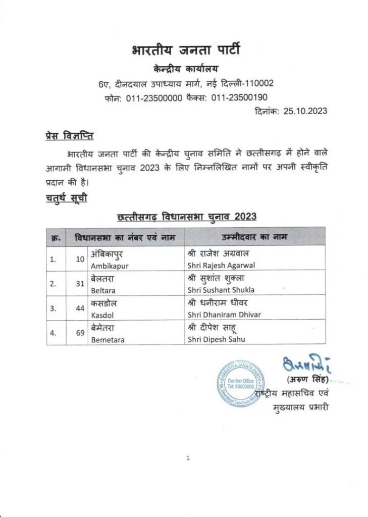 रायपुर। बीजेपी के उम्मीदवारों की चौथी लिस्ट जारी हुई।