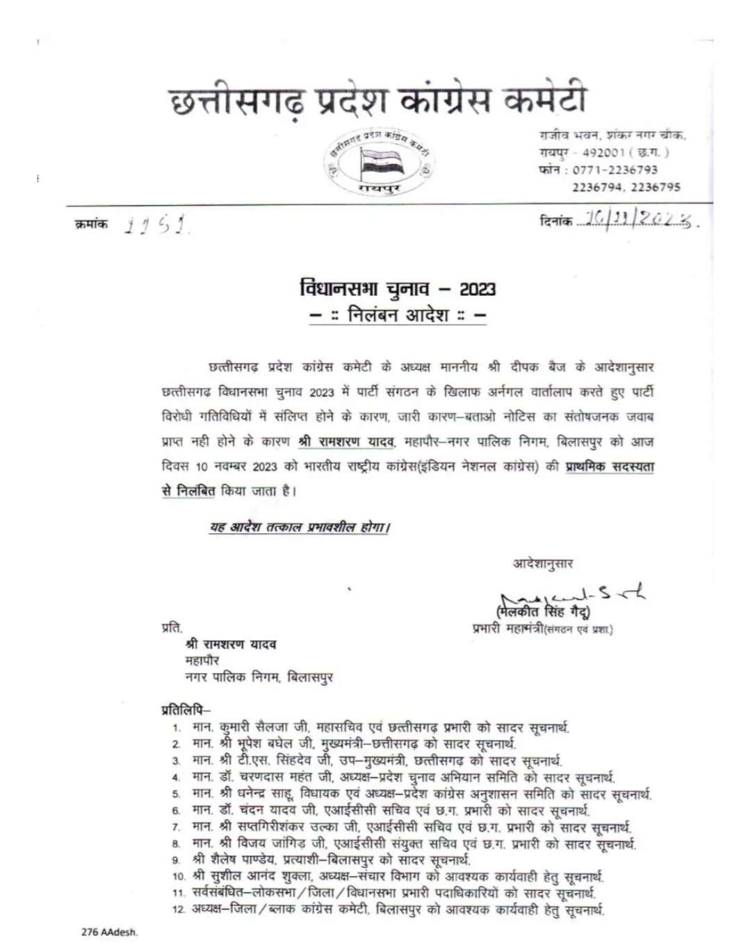 दरअसल एक दिन पहले उन्हें पार्टी संगठन के खिलाफ अर्नगल वार्तालाप करते हुए पार्टी विरोधी गतिविधियों में संलिप्त होने के कारण नोटिस जारी कर 24 घंटे के अंदर उससे जवाब मांगा गया था। लेकिन संतोष जनक जवाब प्राप्त नही प्राप्त होने पर अंततः महापौर रामशरण यादव को आज भारतीय राष्ट्रीय कांग्रेस की प्राथमिक सदस्यता से निलंबित कर दिया है।