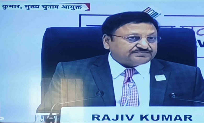 विज्ञान भवन, दिल्ली में आयोजित प्रेस कॉन्फ्रेंस में मुख्य चुनाव आयुक्त राजीव कुमार और चुनाव आयुक्त ज्ञानेश कुमार व एस एस सिंधु ने मीडिया के सामने चुनाव की तिथियों की घोषणा की।