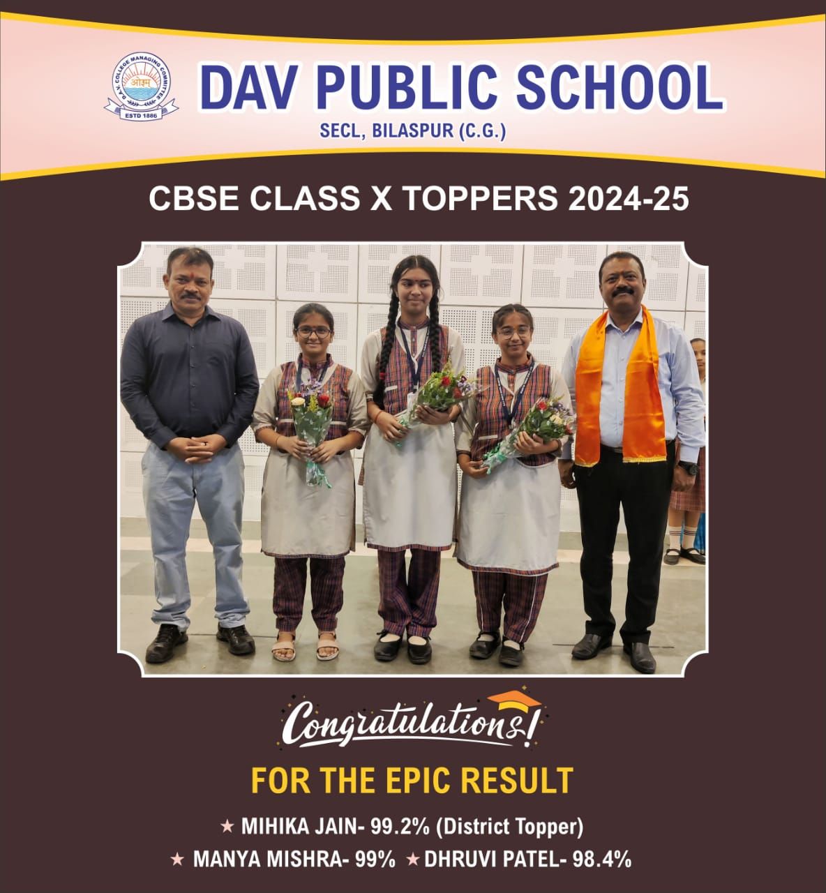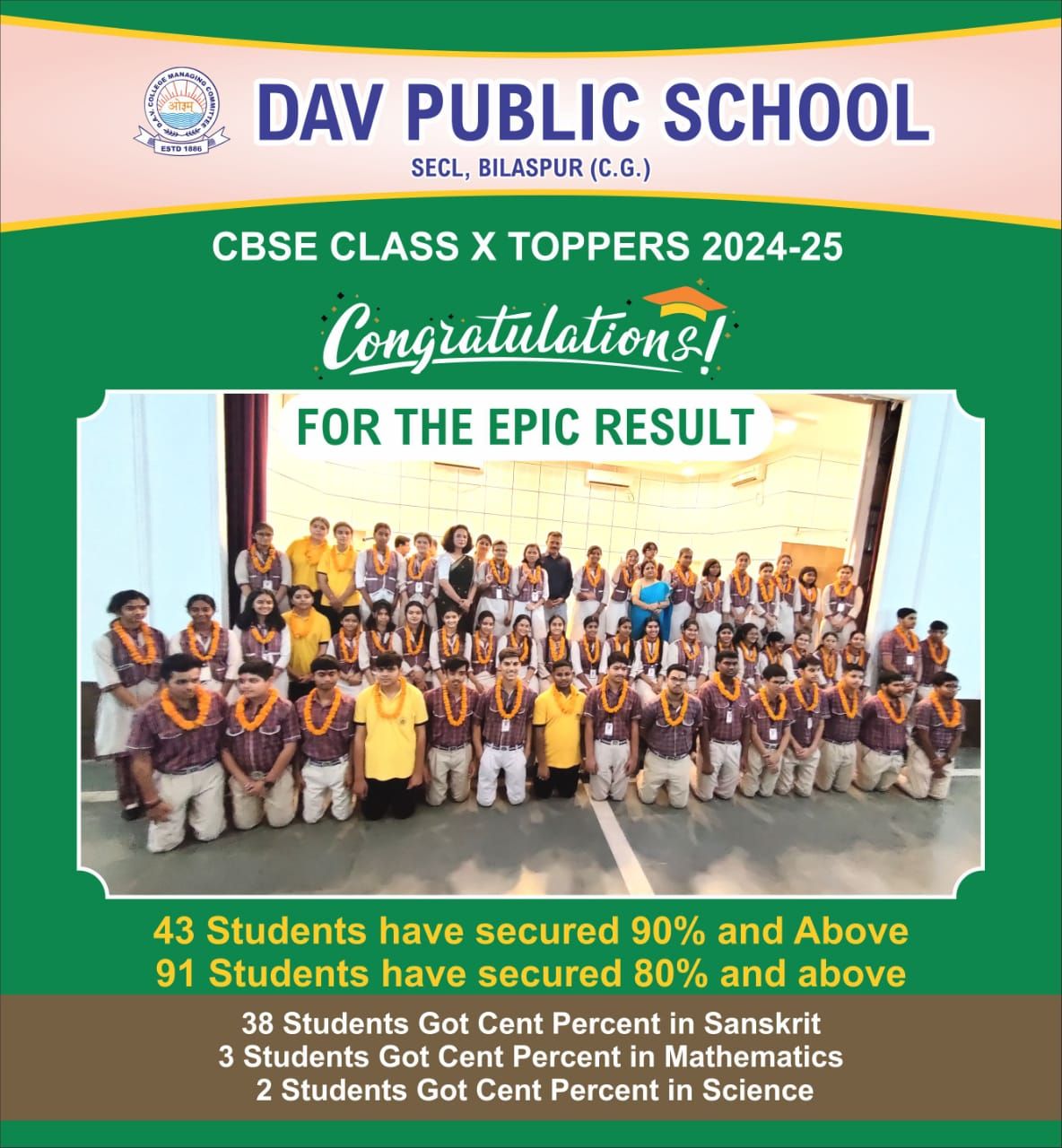 कक्षा 10 के 38 विद्यार्थियों ने संस्कृत, 03 विद्यार्थियों ने गणित एवं 02 विद्यार्थियों ने विज्ञान विषय मे शत-प्रतिशत अंक अर्जित किया है। कक्षा 10वीं की टॉपर कुमारी मिखा जैन 99.2 प्रतिश, कुमारी मान्या मिश्रा 99 प्रतिशत एवं कुमारी ध्रुवी पटेल 98.4 प्रतिशत अंक हासिल किए।