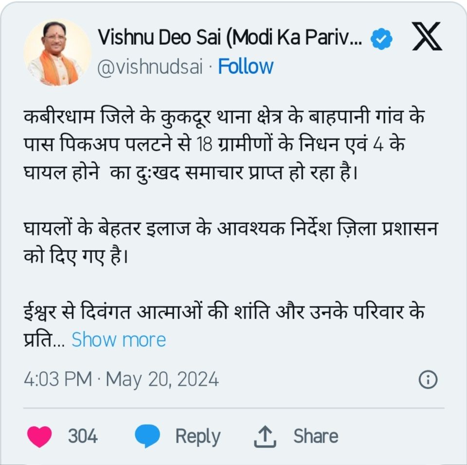 प्रदेश के मुख्यमंत्री विष्णुदेव साय ने इस दुखद हादसे पर अपना गहरा शोक व्यक्त किया है। और घायलों को बेहतर चिकित्सा मुहिया करने के निर्देश अधिकारियों को दिए है। साथ ही इस हादसे में मृतक परिवारों को 5- 5 लाख एवं घायलों को 50- 50 हजार रूपयो की मुआवजे की भी घोषणा की है।