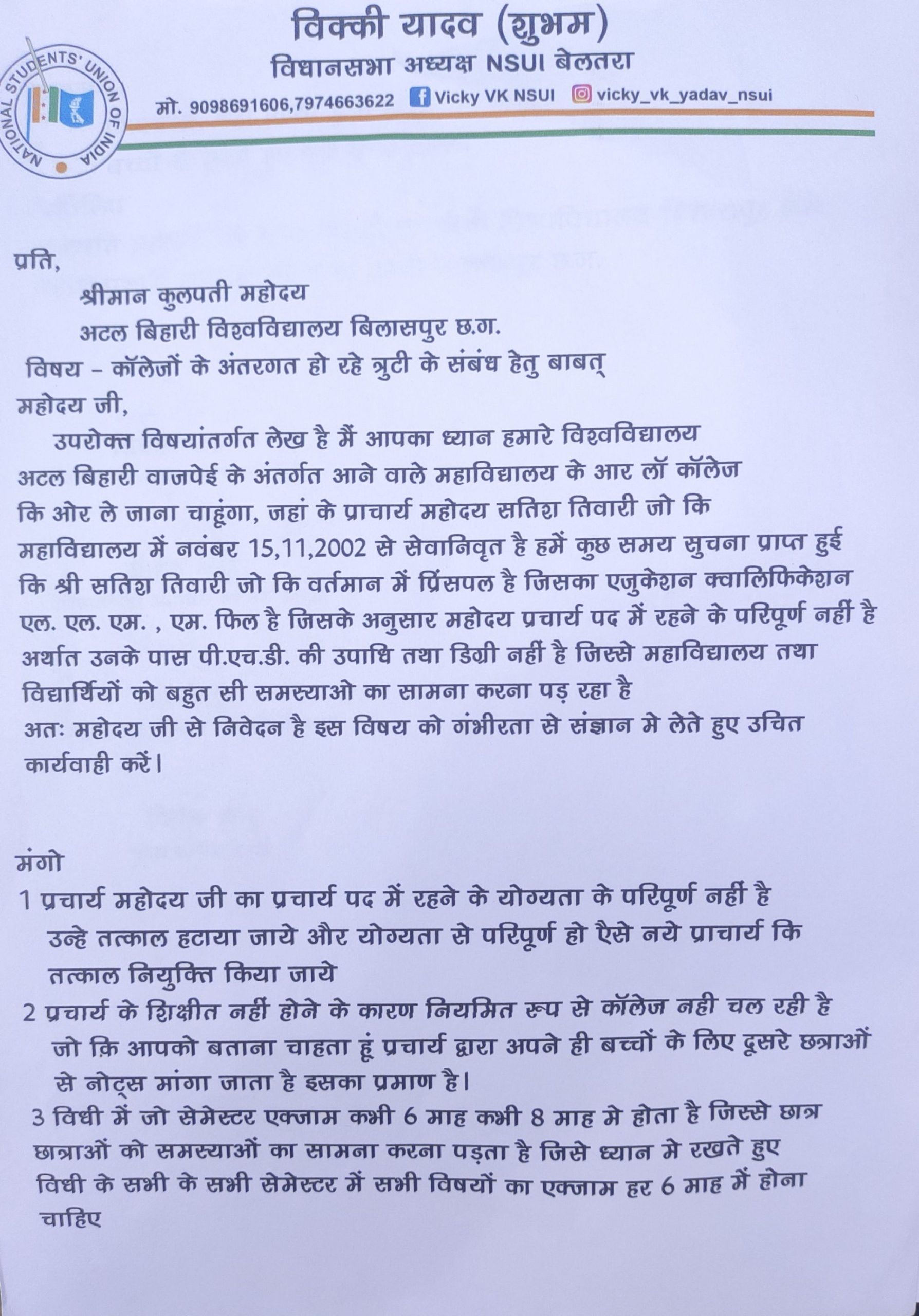 एनएसयूआई बेलतरा विधानसभा के अध्यक्ष विक्की यादव ने इस दौरान कहा कि के आर ला महाविद्यालय के प्राचार्य सतीश तिवारी जो कि वर्तमान में महाविद्यालय के प्रिंसपल है। जिसका एजुकेशन क्वालिफिकेशन एल.एल.एम., एम.फिल है।जो कि प्राचार्य पद में रहने के योग्यता नहीं है अर्थात उनके पास पी.एच.डी. की उपाधि तथा डी लीड नहीं है।