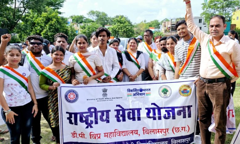 बिलासपुर । देशभक्ति और एकता की भावना को प्रदर्शित करते हुए, राष्ट्रीय सेवा योजना डी पी विप्र कॉलेज के स्वयंसेवकों ने आज ‘हर घर तिरंगा’ अभियान के तहत एक भव्य ध्वज मार्च का आयोजन किया। इस मार्च का उद्देश्य नागरिकों को अपने घरों पर राष्ट्रीय ध्वज फहराने के लिए प्रेरित करना और तिरंगे के प्रति गर्व की भावना को मजबूत करना था।