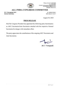 एआईसीसी के जनरल सेक्रेटरी के. सी वेणुगोपाल के द्वारा आज 20 सेकेटरी एवम 03 ज्वाइन सेकेट्रीय की नियुक्ति की गई है जिन्हे 10 राज्यों का प्रभारी बनाया गया है।