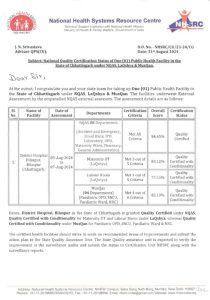 जिला अस्पताल में एनएचएमआरसी की टीम ने 5 अगस्त से लेकर 7 अगस्त तक मूल्यांकन कार्य किया था। इसमें एनक्यूएएस के लिए आठ विभागों (दुर्घटना एवं आपातकाल, ब्लड बैंक, आईपीडी, लेबोरेट्री, ओपीडी, मैटर्निटी वार्ड, फार्मेटी एवं जनरल एडमिनिस्ट्रेशन) का आंकलन किया गया था। आंकलन में बिलासपुर जिला अस्पताल का ओवरआल स्कोर 84.45 फीसदी रहा जिसके आधार पर अस्पताल को एनक्यूएएस क्वालिटी सर्टिफिकेट प्रदान किया गया है। इसके साथ ही लक्ष्य योजना के अंतर्गत मैटर्निटी ओटी एवं लेबर रूम का आंकलन किया गया था तथा मुस्कान योजना के अंतर्गत पीडियाट्रिक ओपीडी, एसएनसीयू, पेडियाट्रिक वार्ड एवं एनआरसी का आंकलन किया गया था। इन दोनों योजनाओं के अंतर्गत भी जिला अस्पताल बिलासपुर को क्वालिटी सर्टिफिकेट प्रदान किया गया है।