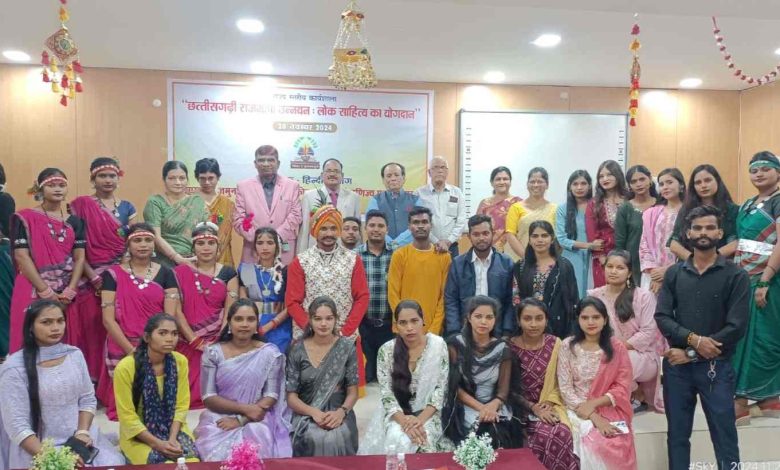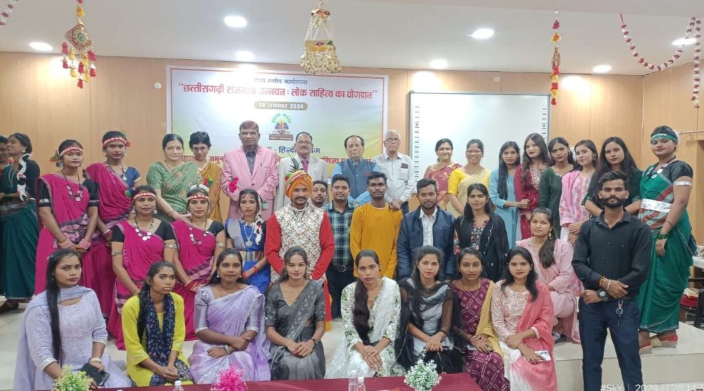 डॉ. विनय कुमार पाठक मुख्य अतिथि की आसंदी से अपना विचार व्यक्त करते हुए कहते है कि किसी भी साहित्य में दुख को मापने का कोई सूत्र नहीं है लेकिन हमारी मातृभाषा में हम अपने दुख को भी माप लेते है। हमारी मातृभाषा में नित नये उपमान, नया सौंदर्य बोध, नये बिम्ब हम सहज ही उद्भूत कर लेते है “चोच तोर दिखत लाली लाली कुंदरू आंखी तोर मसरी के दार” संस्कृति जो साहित्य को संजोत है वही जीवित रहता हैं यह अन्योन्य आश्रित है। एम.ए. प्रथम सेमेस्टर एवं तृतीय सेमेस्टर के छात्र/छात्राओं ने छत्तीसगढ़ी संस्कृति को संजोते हुए रंगारंग सांस्कृतिक कार्यक्रम की प्रस्तुति दी तथा आभार प्रदर्शन डॉ. परमजीत पाण्डेय द्वारा किया गया।