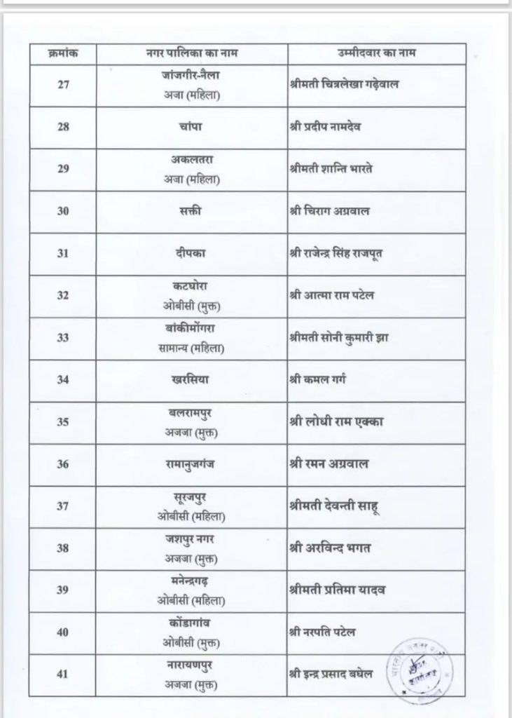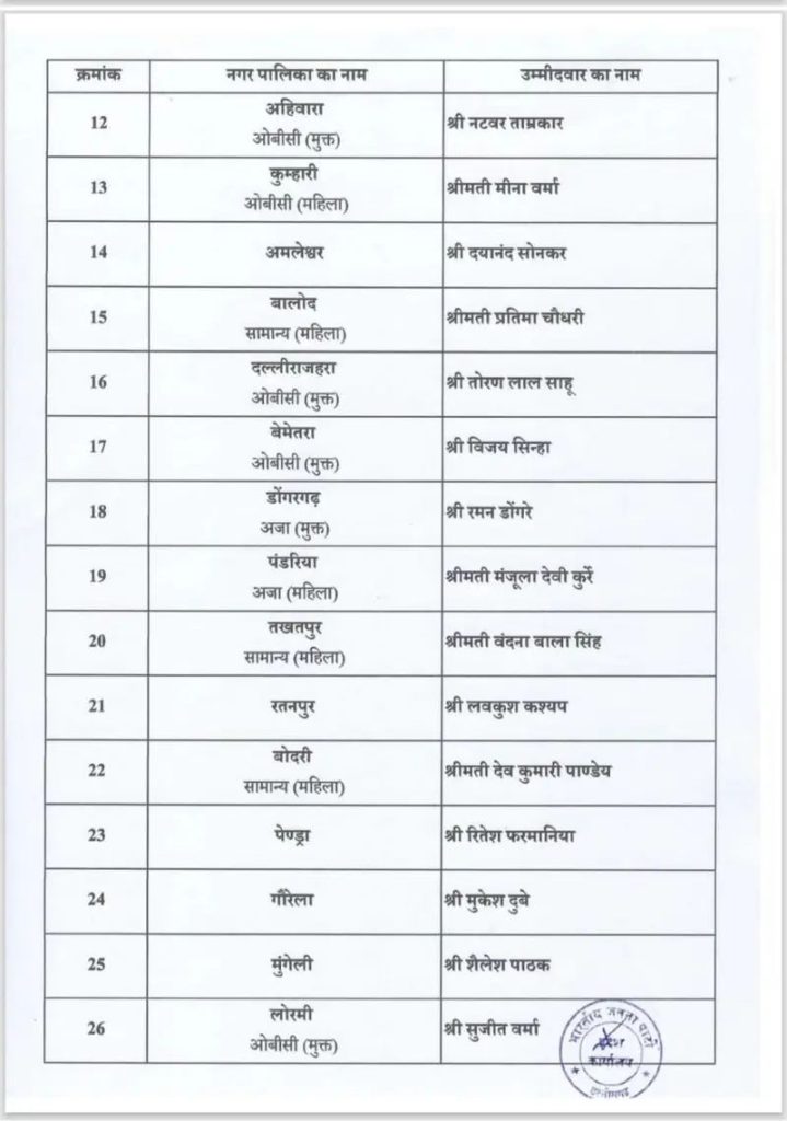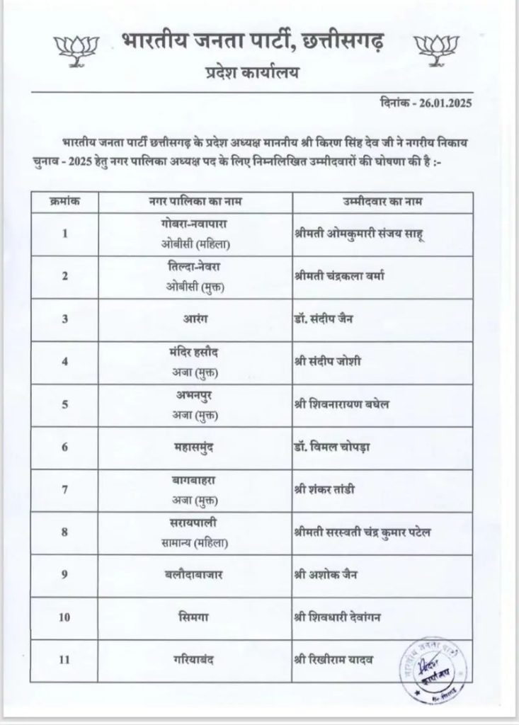 रायपुर। भारतीय जनता पार्टी के प्रदेश अध्यक्ष किरण सिंहदेव ने नगरीय निकाय चुनाव 2025 के नगर पालिका अध्यक्ष पद के लिए उम्मीदवारों की सूची जारी की। •देखिए जारी सूची....