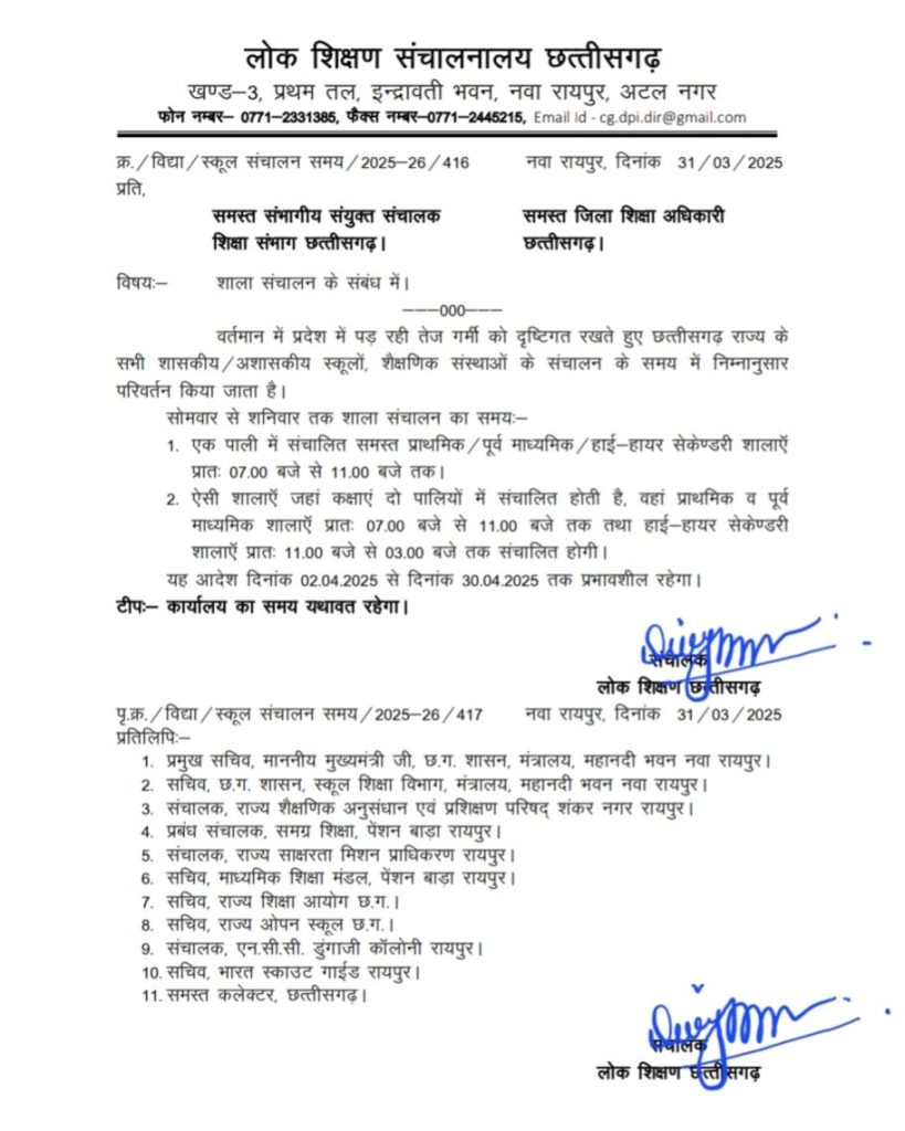 उक्त आदेश लोक शिक्षण संचालनालय, रायपुर द्वारा बढ़ती तेज धूप एवं गर्मी की देखते हुए जारी किया गया है।