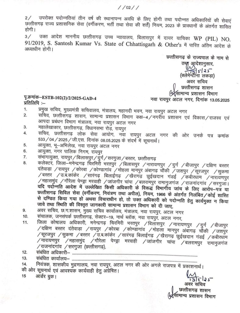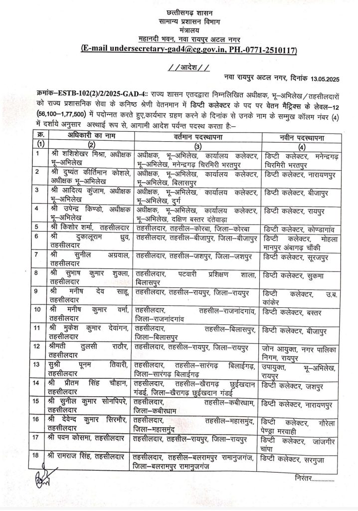 बड़ी खबर। राज्य शासन के 18 तहसीलदारों का डिप्टी कलेक्टर के पद पर हुआ पदोन्नति