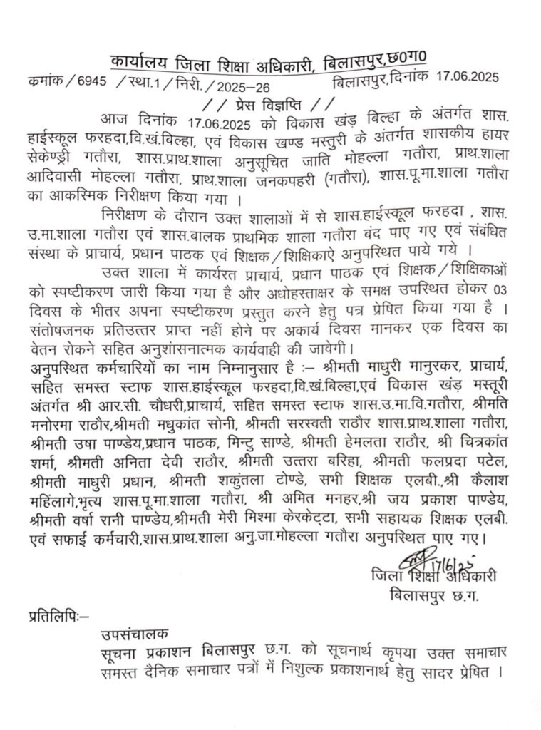 अनुपस्थित कर्मचारियों का नाम निम्नानुसार है श्रीमती माधुरी मानुरकर, प्राचार्य, सहित समस्त स्टाफ शास. हाईस्कूल फरहदा, वि.खं. बिल्हा, एवं विकास खंड़ मस्तूरी अंतर्गत श्री आर.सी. चौधरी, प्राचार्य, सहित समस्त स्टाफ शास.उ.मा.वि.गतौरा, श्रीमति मनोरमा राठौर, श्रीमती मधुकांत सोनी, श्रीमती सरस्वती राठौर शास.प्राथ. शाला गतौरा, श्रीमती उषा पाण्डेय, प्रधान पाठक, मिन्दु साण्डे, श्रीमती हेमलता राठौर, चित्रकांत शर्मा, श्रीमती अनिता देवी राठौर, श्रीमती उत्तरा बरिहा, श्रीमती फलप्रदा पटेल, श्रीमती माधुरी प्रधान, श्रीमती शकुंतला टोण्डे, सभी शिक्षक एलबी. कैलाश महिंलागे, भृत्य शास.पू.मा.शाला गतौरा, अमित मनहर, श्री जय प्रकाश पाण्डेय, श्रीमती वर्षा रानी पाण्डेय, श्रीमती मेरी मिश्मा केरकेट्टा, सभी सहायक शिक्षक एलबी. एवं सफाई कर्मचारी, शास.प्राथ. शाला अनु.जा. मोहल्ला गतौरा अनुपस्थित पाए गए।
