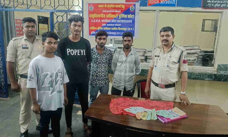 बिलासपुर । कोटा पुलिस ने स्कूल परिसर में जुआ खेलते 4 आरोपियों की गिरफ्तार किया है।