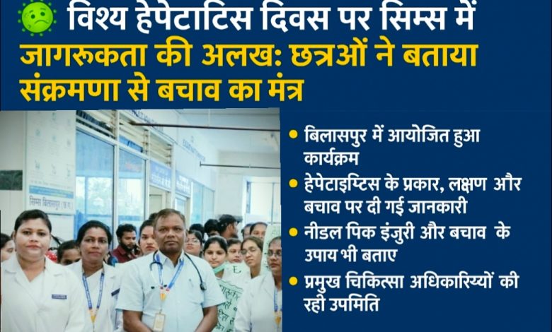 बिलासपुर। “विश्व हेपेटाइटिस दिवस” के अवसर पर सिम्स (छत्तीसगढ़ आयुर्विज्ञान संस्थान) बिलासपुर में हेपेटाइटिस जैसे घातक वायरल संक्रमण के प्रति जन जागरूकता फैलाने के उद्देश्य से एक विशेष जागरूकता कार्यक्रम का आयोजन किया गया।