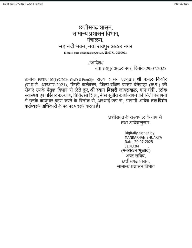 रायपुर। राज्य शासन द्वारा महत्वपूर्ण प्रशासनिक आदेश जारी करते हुए डिप्टी कलेक्टर कमल किशोर (जिला- दक्षिण बस्तर दंतेवाड़ा) को स्वास्थ्य मंत्री राम बिहारी जायसवाल के लिए विशेष कर्तव्य अधिकारी (OSD) के रूप में अस्थायी रूप से आगामी आदेश तक पदस्थ किया गया है।