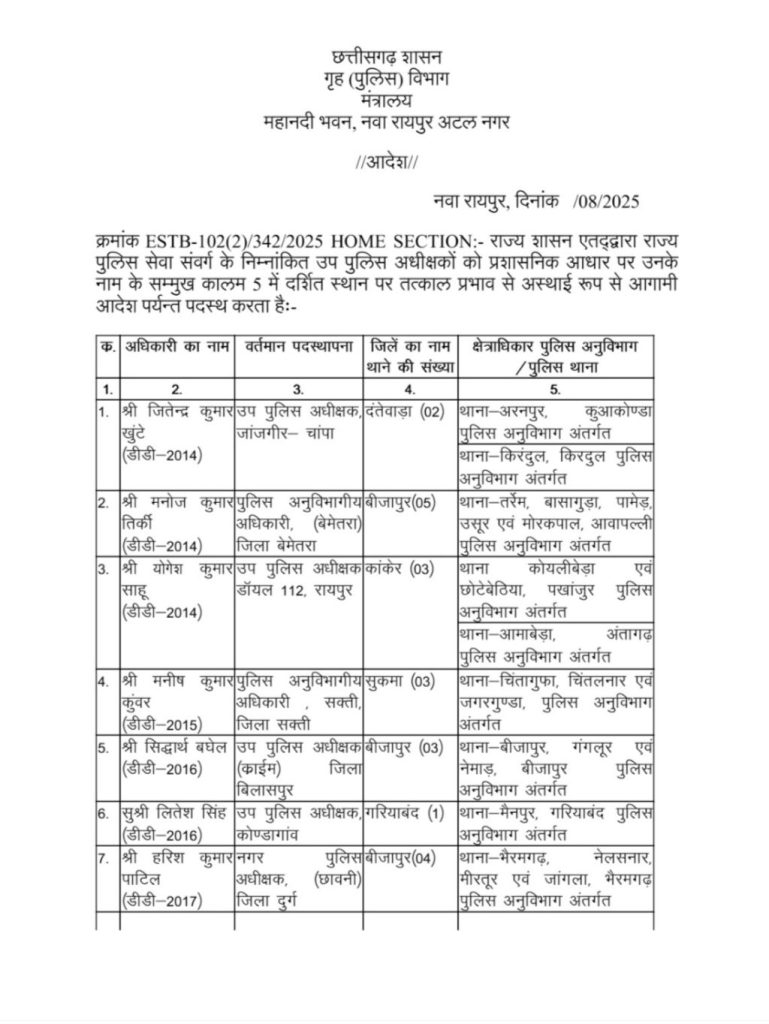 प्रदेश के 11 डीएसपी के हुए तबादले,ज्यादातर अधिकारियों को नक्सली क्षेत्रों में भेजा गया
