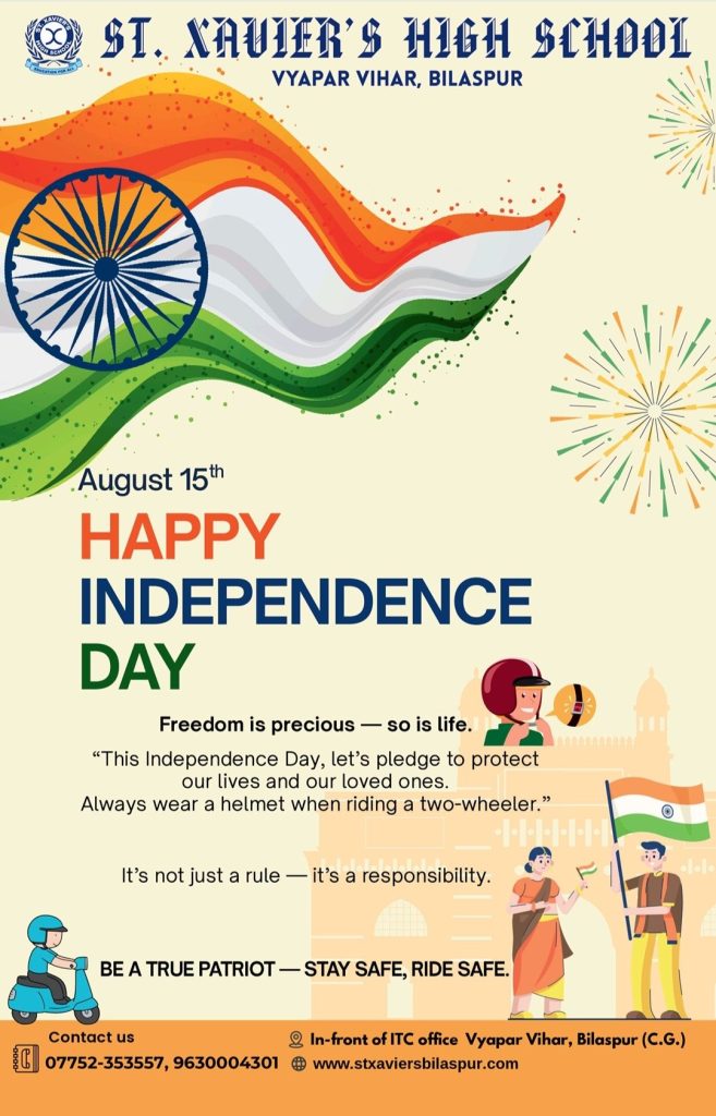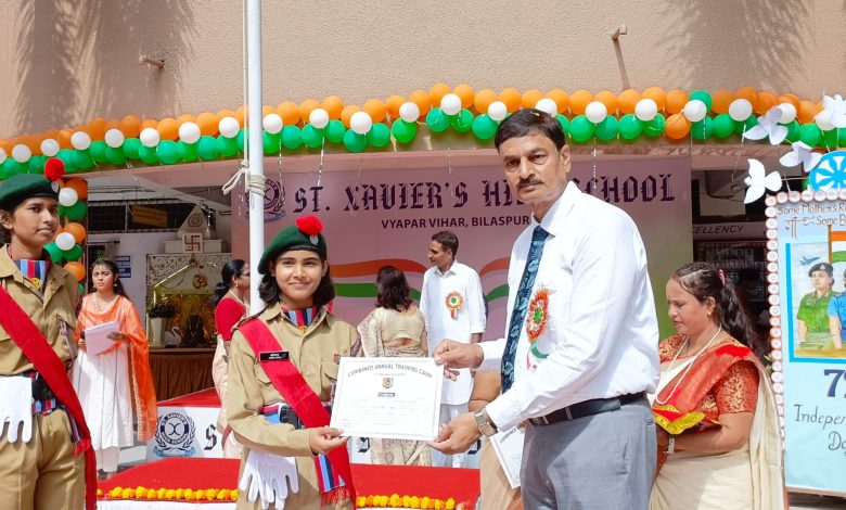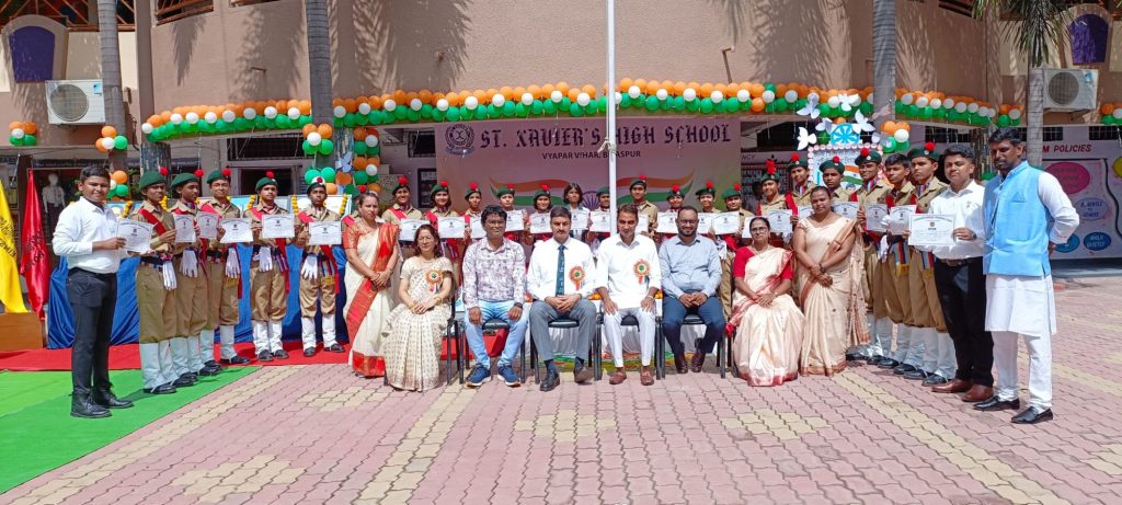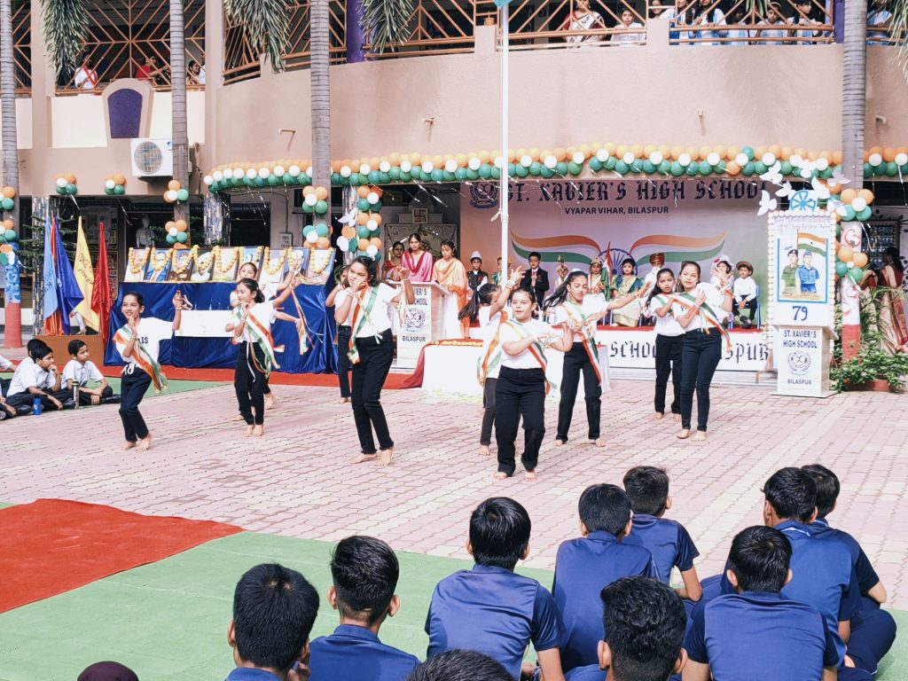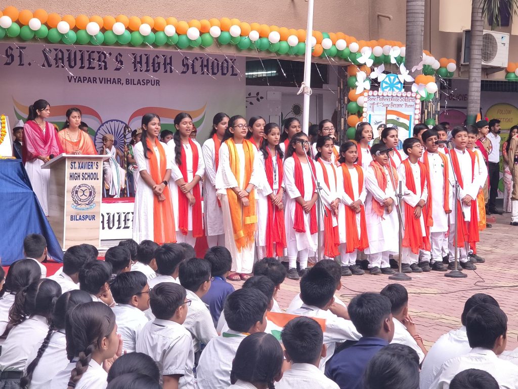 बिलासपुर। सेंट जेवियर्स हाई स्कूल, व्यापार विहार, बिलासपुर में भारत के 79वें स्वतंत्रता दिवस का आयोजन बड़े ही देशभक्ति और उत्साह के साथ किया गया। इस अवसर पर मुख्य अतिथि ग्रुप कैप्टन (सेवानिवृत्त) एस.के. पांडे और विशिष्ट अतिथि रितेश मसीह तथा सुरेन्द्र चित्रकार उपस्थित रहे।