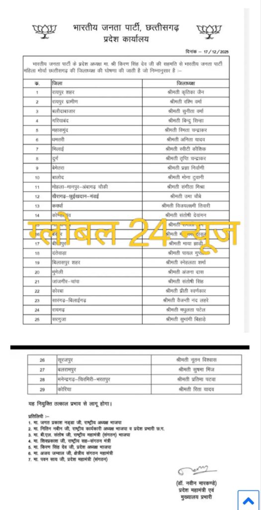 रायपुर/बिलासपुर। भाजपा अध्यक्ष किरण देव सिंह ने महिला मोर्चा के प्रदेश पदाधिकारियों और जिला अध्यक्षों की नियुक्ति कर दी है। महिला मोर्चा में प्रदेश पदाधिकारी के साथ 29 जिले के अध्यक्षों की नाम की भी घोषणा की गई है।