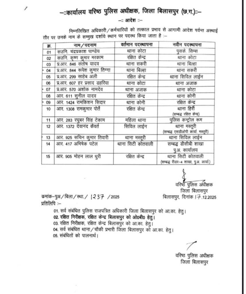 वरिष्ठ पुलिस अधीक्षक कार्यालय से जारी आदेश क्रमांक 1237/2025 के अनुसार सभी संबंधित अधिकारियों को निर्देशित किया गया है कि वे तत्काल नवीन पदस्थापना स्थल पर कार्यभार ग्रहण करें।