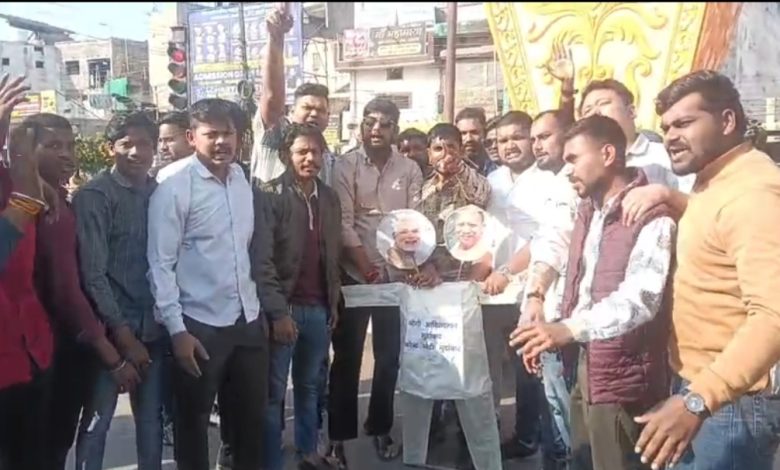 बिलासपुर। नेशनल स्टूडेंट्स यूनियन ऑफ इंडिया (एनएसयूआई) के तत्वावधान में सोमवार को बिलासपुर के महामाया चौक पर बेलतरा विधानसभा अध्यक्ष विक्की यादव के नेतृत्व में प्रधानमंत्री नरेंद्र मोदी एवं उत्तरप्रदेश के मुख्यमंत्री योगी आदित्यनाथ का पुतला दहन कर जोरदार विरोध प्रदर्शन किया गया।