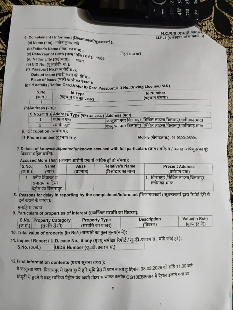प्रार्थी से मिली जानकारी के अनुसार पेट्रोल पम्प के कर्मचारी इसी बात को लेकर वाद विवाद करने लगे और जब मैनेजर को फोन लगाने लगे तो मनीष दिवाकर ने झापड़ मार दिया। फिर राजाराम आया जिन्होंने हाथ पर पहने चूड़ा से मारपीट करने लगा तथा लात से मारपीट शुरु कर दी। जिसकी वजह से पहना हुआ घड़ी भी टूट गया। और सिर पर भी चोट लगी है। आरोपियों द्वारा अश्लील गाली गलौच कर धमकी भी दिया गया जो पास में लगे सीसीटीवी में रिकॉर्डेड भी है।