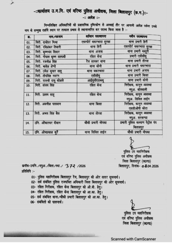 बिलासपुर । जिले के एसएसपी रजनेश सिंह ने एक बड़ी फेरबदल करते हुए कई थानों के प्रभारियों को बदलाव किया है, जिसे लेकर जारी आदेश में थाना प्रभारी और चौकी प्रभारियों के नाम शामिल है। लिस्ट में 13 निरीक्षक और 2 उपनिरीक्षक के नाम शामिल है जिन्हें अलग अलग थाने और चौकी की तैनाती सौपी गई।