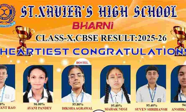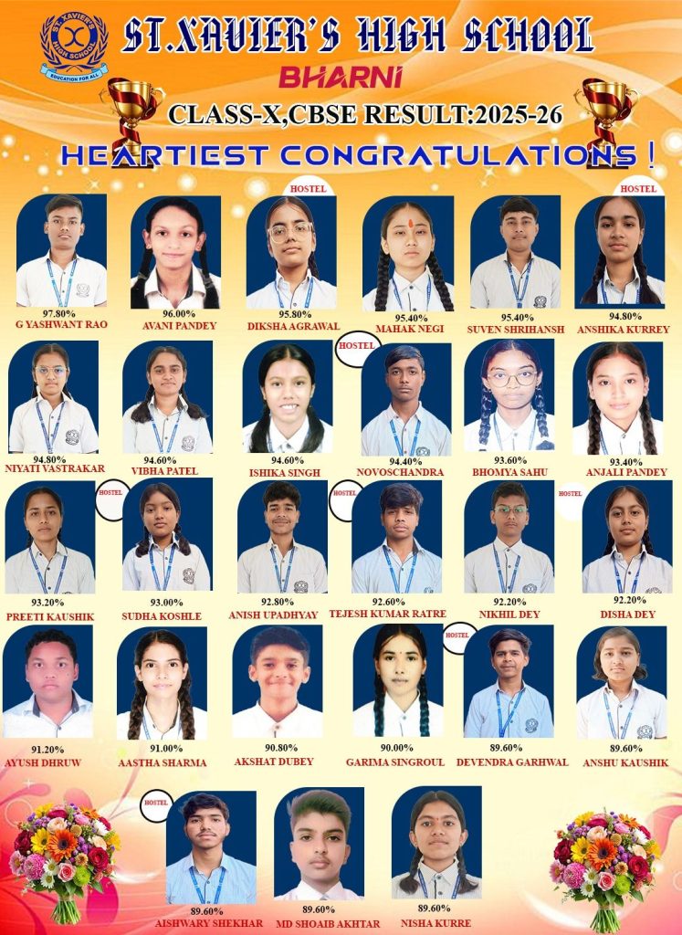 बिलासपुर। केंद्रीय माध्यमिक शिक्षा बोर्ड (सीबीएसई) द्वारा सत्र् 2025-26 में आयोजित दसवीं बोर्ड परीक्षा का परिणाम दिनांक – 15/04/26 को घोषित हुआ, जिसमें सेंट जेवियर्स हाई स्कूल, भरनी के छात्रों ने अपना परचम लहराते हुए एक अभूतपूर्व नया कीर्तिमान स्थापित किया है।