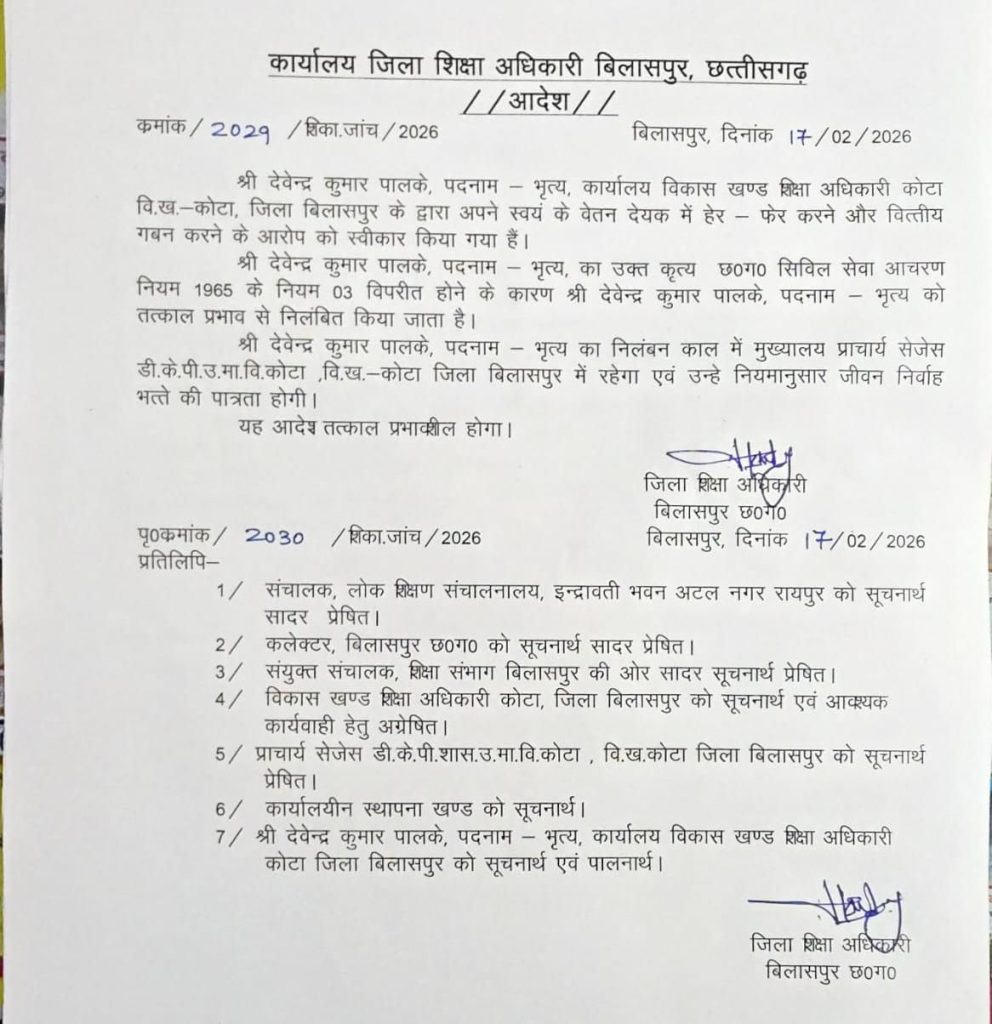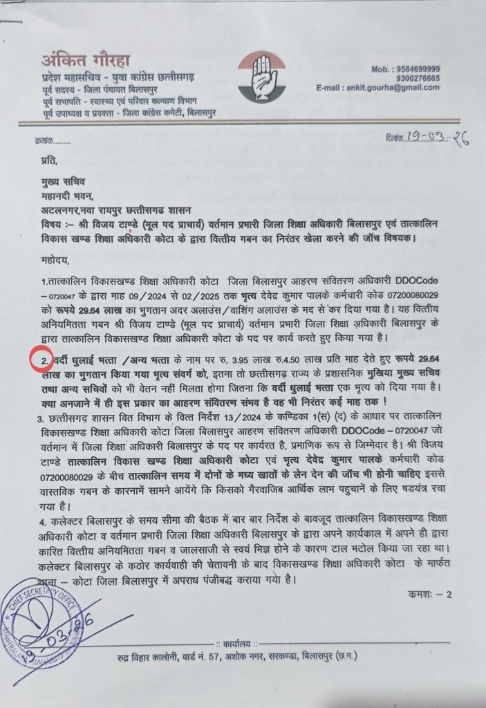 कांग्रेस नेता अंकित ने इस कार्रवाई के बाद भी कई महत्वपूर्ण सवाल खड़े करते हुए कहा कि शिकायत में तत्कालीन विकासखंड शिक्षा अधिकारी कोटा एवं वर्तमान जिला शिक्षा अधिकारी बिलासपुर विजय टांडे की भूमिका को लेकर भी गंभीर आरोप लगाए गए थे। आरोप है कि वित्तीय अनियमितताओं का यह पूरा खेल उनके कार्यकाल में हुआ, इसके बावजूद अब तक उनके खिलाफ कोई ठोस कार्रवाई सामने नहीं आई है। उल्टा, उन्हें पदोन्नति दिए जाने की जानकारी सामने आने से पूरे मामले की निष्पक्षता पर सवाल उठने लगे हैं।
