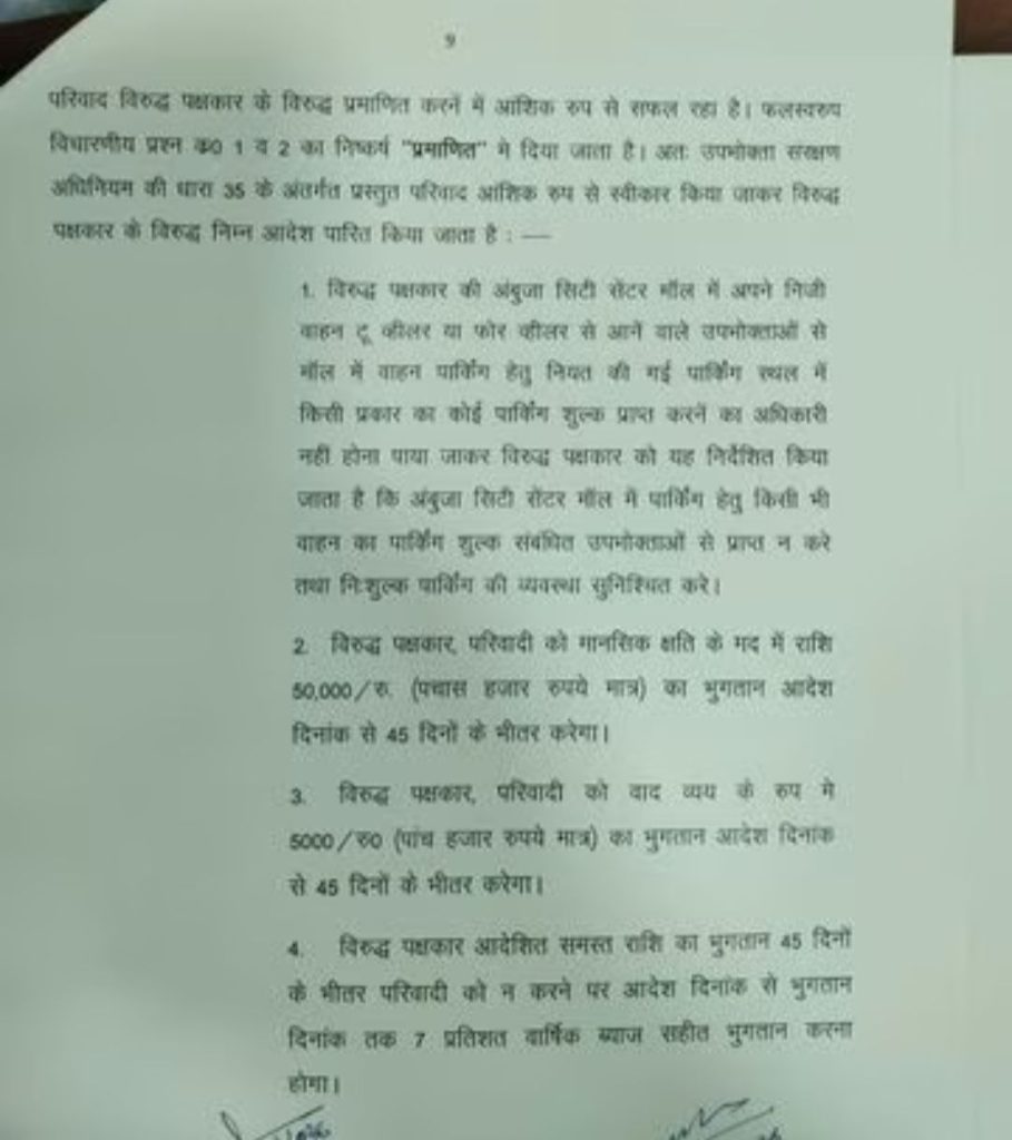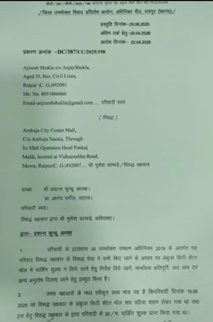 जानकारी के अनुसार, 15 जून 2025 को अधिवक्ता अंजिनेश शुक्ला अपनी फोर व्हीलर से अंबुजा मॉल पहुंचे, जहां उनसे ₹30 पार्किंग शुल्क लिया गया। उन्होंने आपत्ति जताते हुए कहा कि वे केवल अपनी माता को छोड़ने आए हैं और पार्किंग का उपयोग नहीं करेंगे। इसके बावजूद मॉल प्रबंधन ने यह कहकर शुल्क लिया कि परिसर में फ्री पिक- अप और ड्रॉप की सुविधा उपलब्ध नहीं है। इसी के बाद अधिवक्ता ने इसे उपभोक्ता अधिकारों का उल्लंघन बताते हुए आयोग में परिवाद प्रस्तुत किया।