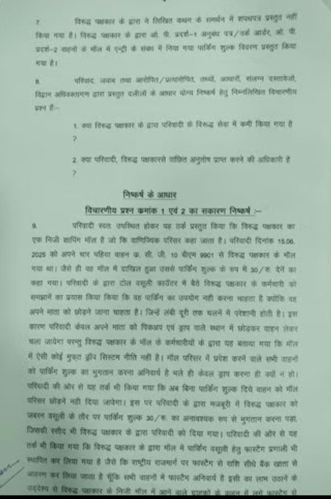 यह आदेश प्रकरण क्रमांक DC/387/CC/2025/198 में पारित किया गया, जिसमें उच्च न्यायालय के अधिवक्ता अंजिनेश शुक्ला ने परिवाद दायर किया था। मामले में उन्होंने स्वयं पैरवी करते हुए मॉल प्रबंधन द्वारा की जा रही पार्किंग शुल्क वसूली को अवैध बताया।